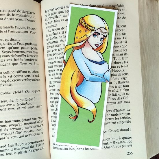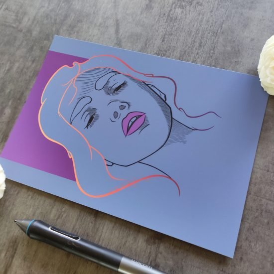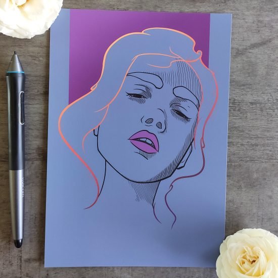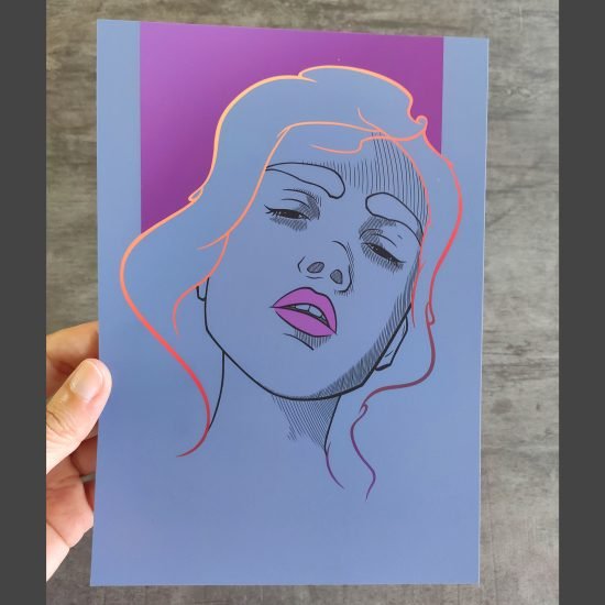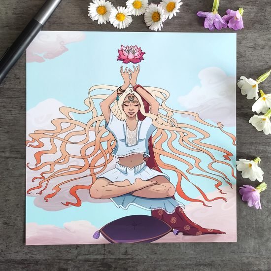 ? Impression d’art réalisée à partir d’une illustration dessinée à la main. L’impression est en couleur et comporte des touches dorées peinte à la main (diadème, cheveux).