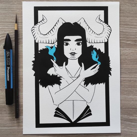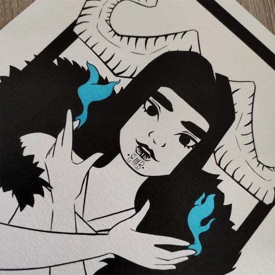 ? Impression d’art réalisée à partir d’une illustration dessinée à la main. L’impression est en noir et blanc avec une touche de bleu (flamme).