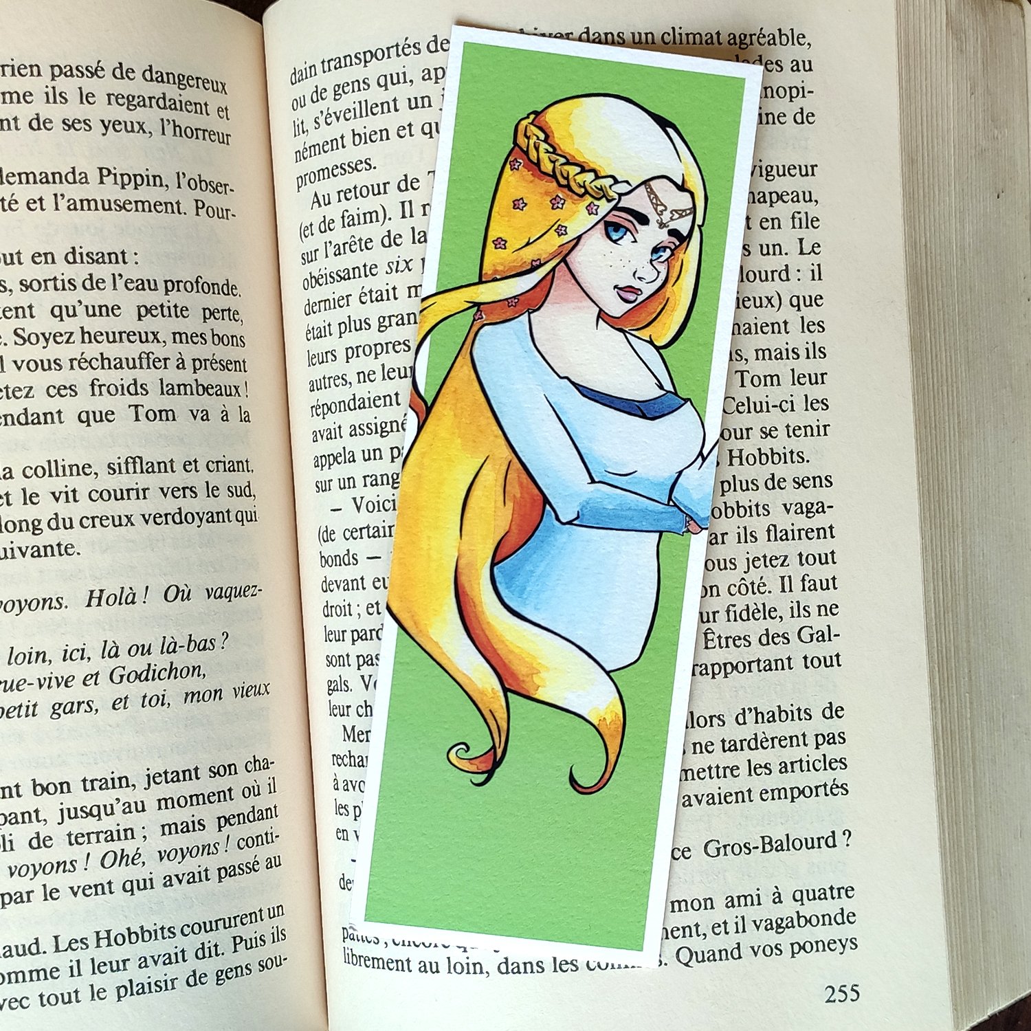 ? Impression de marque-pages réalisée à partir d’une illustration dessinée à la main (Idunn et Dame du Lac). L’impression est en couleur.