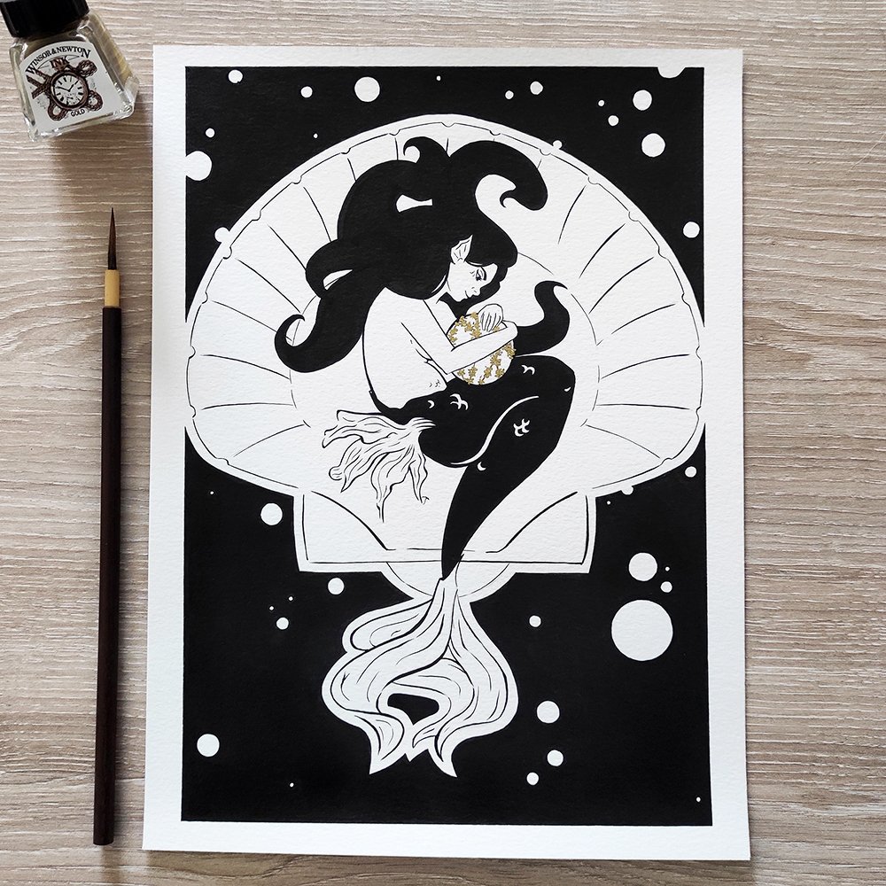 ? Cette illustration a été réalisée avec de l’encre noire au pinceau japonais et de l’encre métallique.